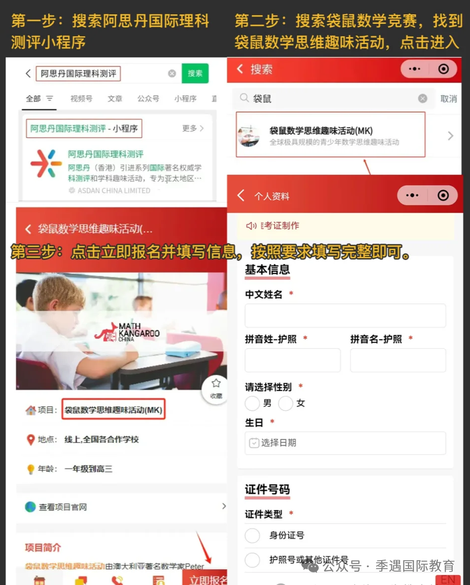 - 微信小程序报名:微信搜索“阿思丹国际理科测评”小程序,注册或登录账号,完善学生信息,搜索“袋鼠数学竞赛”,点击“立即报名”,填写报名信息并缴费。