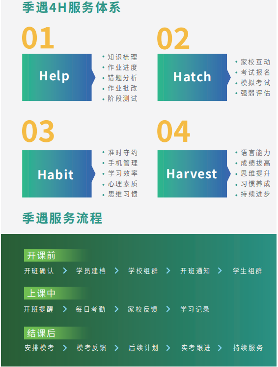 季遇独家4H体系,即Help、Hatch、Habit、Harvest,在季遇学习,我们不仅注重在课上帮助孩子重构数学框架,提升数学能力,在课后更是注重帮孩子养成一个良好的学习习惯,收获的不仅仅是袋鼠和SASMO竞赛的证书、数学能力的提升,更能收获一个良好的学习习惯。