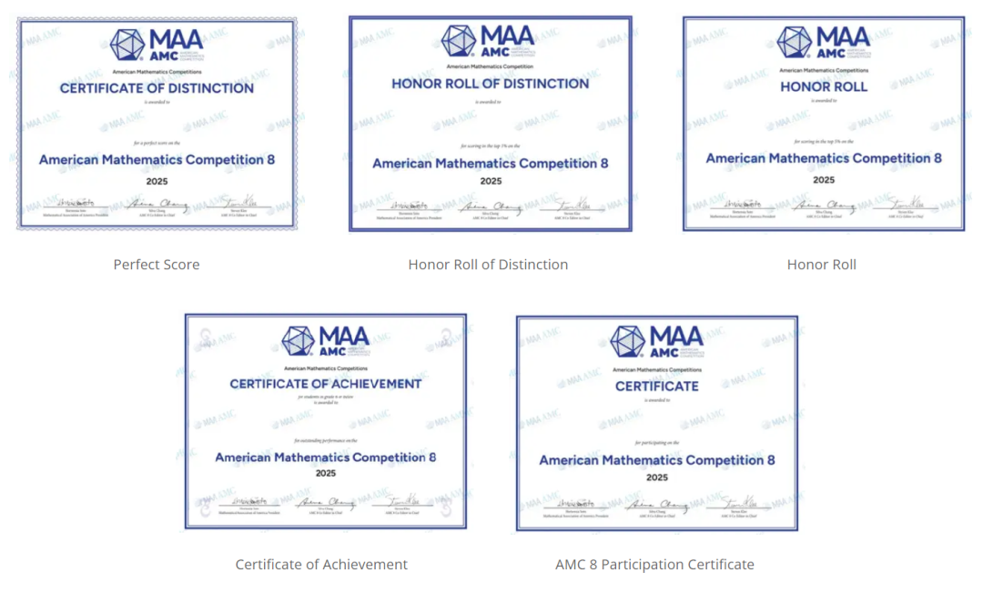 - 全球荣誉奖(Achievement Roll,AR):6年级及以下且在AMC8中获得15分以上的学生。
