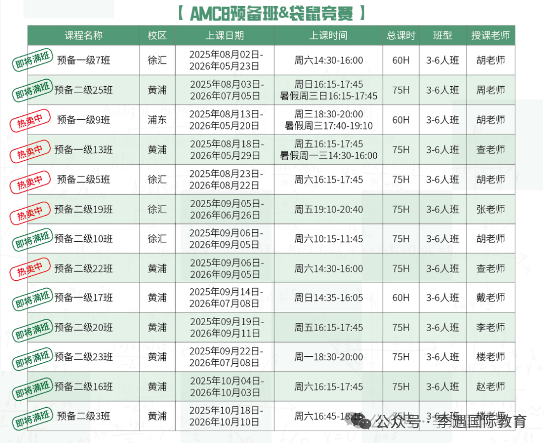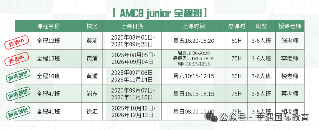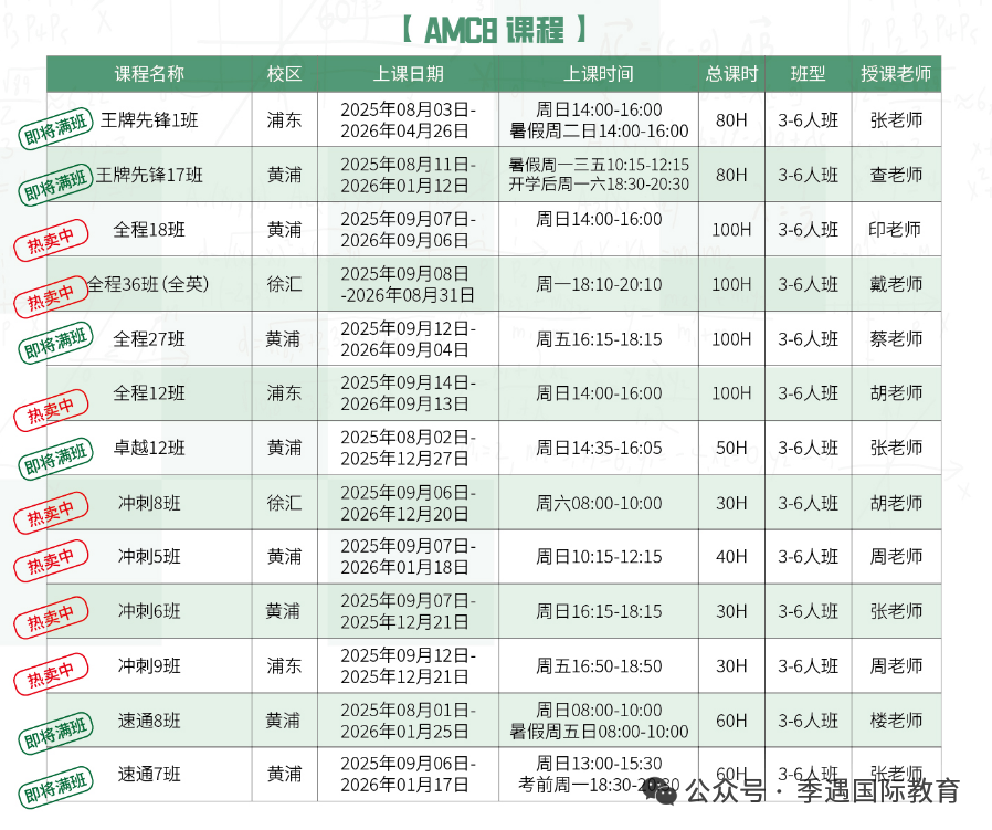 上海季遇AMC8秋季课程火热招生中!基础班、冲刺班、全程班一应俱全,全方位满足不同阶段学生需求。作为低年级爬藤的首选竞赛,AMC8备受瞩目。秋季培训课程专为3 - 8年级学生量身打造,深度聚焦AMC8四大核心板块,涵盖从入门基础到冲击TOP1%的全部内容。抓住这最后的备考黄金期,让孩子在起跑线上脱颖而出,在升学之路上更有优势!