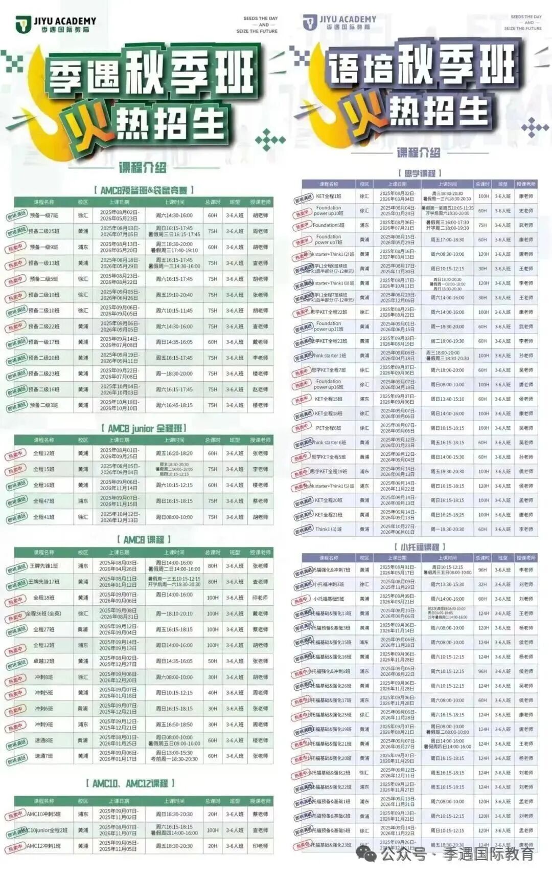 班型灵活: 基础班、强化班、冲刺班、全程班型可选。 教学模式: 采用3-6人精品小班制或1V1个性化教学。 授课形式: OMO线上线下同步(线上小班直播,线下校区面授),学习方式灵活便捷。 【AMC系列课程】 目标人群:6-9岁,对思维数学有兴趣,或是有志于包括参加袋鼠、SASMO、澳洲AMC,以及美国AMC8等国内国际数学竞赛的学生; 目标人群:有明确参赛目标,希望提前在低年级开始系统性准备参赛的学生 目标人群:适合4-7年级的不同数学基础的学生,目标AMC8 前5%,前1% ; 目标人群:参加2025年11月AMC10/12竞赛的考试,系统备考冲刺高分奖项。 【小托福系列课程】 季遇国际教育设有小托福预备班,小托福基础班、小托福强化班、小托福冲刺班等产品体系及基础入门、全面强化和单项冲刺多种班型!
