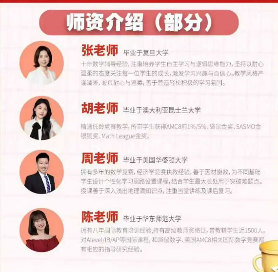 AMC8课程采用全英文教学/中英双语教学。(能够进行双语教学的老师,意味着其具备较高的国际化背景和对数学科目的深度理解)