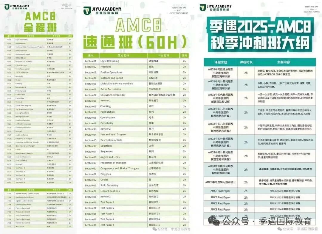 季遇教育一站式解决方案【AMC8全阶系统课】。季遇教育推出AMC8预备课程/AMC8 Junior/AMC8基础班、冲刺班、强化班等课程,针对不同年龄的不同学习阶段的重点内容为基础,系统地学习AMC8的知识体系,科学高效备考,带领学生在AMC8考试中冲击前1%奖项。
