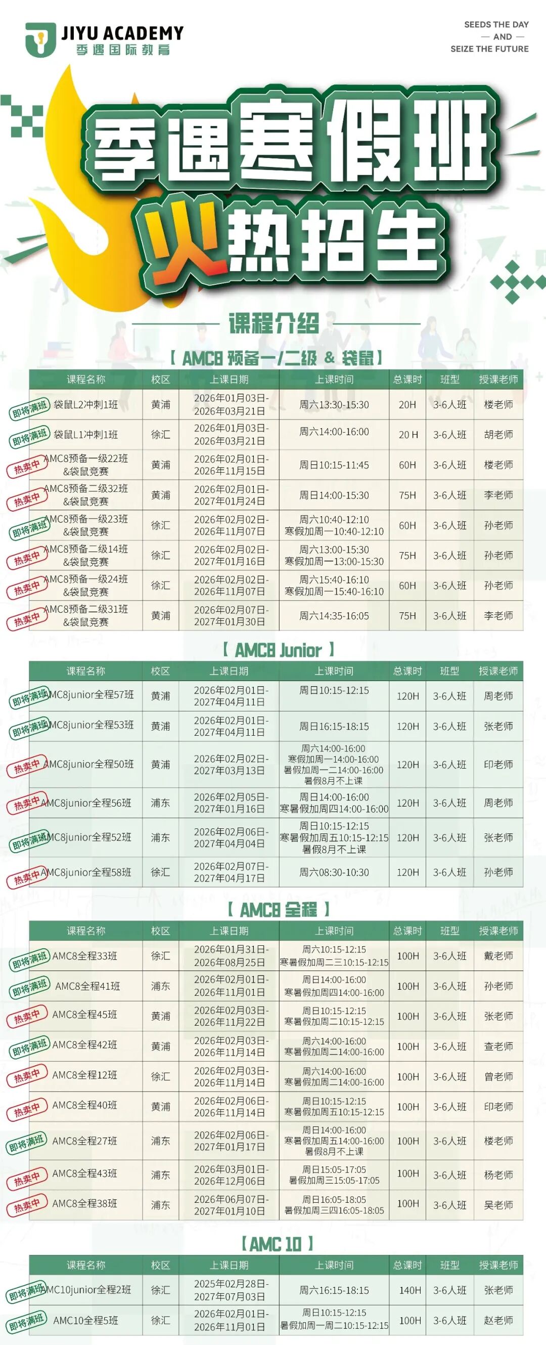 【AMC系列课程设置】 适合学生:6-9岁,对思维数学有兴趣,或是有志于包括参加袋鼠、SASMO、澳洲AMC,以及美国AMC8等国内国际数学竞赛的学生; 适合学生:有明确参赛目标,希望提前在低年级开始系统性准备参赛的学生 适合学生:适合4-7年级的不同数学基础的学生,目标AMC8 前5%,前1% ; 适合学生:参加2025年11月AMC10/12竞赛的考试,系统备考冲刺高分奖项。AMC8预备班(1级/2级)