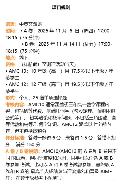 2025AMC10/12奖项设置新变化! 1.新增两大全球荣誉奖项: TOP1%(全球卓越奖)、TOP5%(全球优秀奖)、AIME 晋级线(AMC10 前 2.5%/AMC12 前 5%)、低年级成就奖(AMC10 8 年级及以下≥90 分 / AMC12 10 年级及以下≥90 分)等关键奖项标准均没有调整,核心晋级通道不受影响。