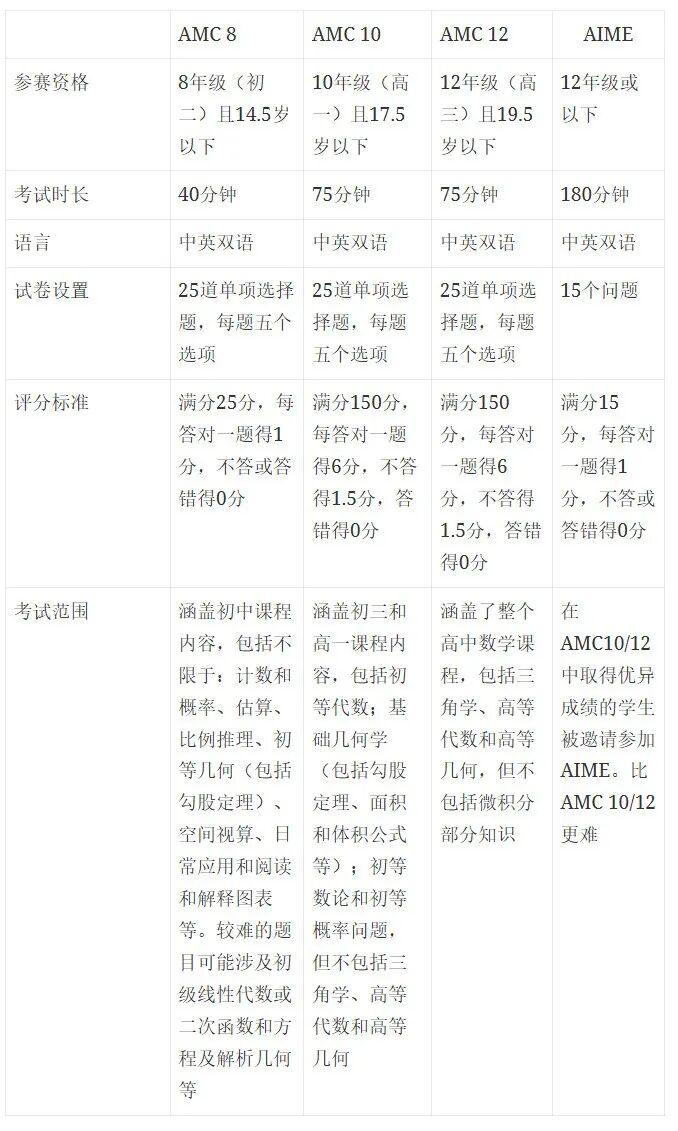 AMC 8: 参赛资格:8年级(初二)且14.5岁以下。 考试时长:40分钟。 语言:中英双语。 试卷设置:25道单项选择题,每题五个选项。 评分标准:满分25分,每答对一题得1分,不答或答错得0分。 考试范围:涵盖初中课程内容,包括不限于:计数和概率、估算、比例推理、初等几何(包括勾股定理)、空间视算、日常应用和阅读和解释图表等。较难的题目可能涉及初级线性代数或二次函数和方程及解析几何等。 AMC 10: 参赛资格:10年级(高一)且17.5岁以下。 考试时长:75分钟。 语言:中英双语。 试卷设置:25道单项选择题,每题五个选项。 评分标准:满分150分,每答对一题得6分,不答得1.5分,答错得0分。 考试范围:涵盖初三和高一课程内容,包括初等代数;基础几何学(包括勾股定理、面积和体积公式等);初等数论和初等概率问题,但不包括三角学、高等代数和高等几何。 AMC 12: 参赛资格:12年级(高三)且19.5岁以下。 考试时长:75分钟。 语言:中英双语。 试卷设置:25道单项选择题,每题五个选项。 评分标准:满分150分,每答对一题得6分,不答得1.5分,答错得0分。 考试范围:涵盖了整个高中数学课程,包括三角学、高等代数和高等几何,但不包括微积分部分知识。 根据2025年AMC10/12竞赛的相关安排,成绩预计在考后4-6周公布。 好消息,今年AMC10、AMC12数学竞赛将【新增两个奖项】,即全球前10%荣誉奖和全球前25%荣誉奖!MAA这次的改革使得AMC10/12获奖机会增多,让中等生也有了争获荣誉的可能。 AMC10/12数学竞赛成绩查询方式: AMC中国区组委会官网 登录AMC中国区组委会的官方网站www.math-table.com 点击“Personal Center”—“Scores” 输入报名手机号,验证后即可查询成绩 阿思丹官网或者微信小程序查询登录阿思丹官网: http://www.seedasdan.org/ 找到并点击成绩查询链接,输入报名手机号,验证后即可查询成绩。 点击微信小程序——“阿思丹国际理科测评”,点击【我的报名】——点击对应项目(AMC10/12)——【成绩查询】,即可查分。 AMC10/12最新奖项设置: ▸Perfect Score 满分奖 ▸HonorRoll of Distinction 全球卓越奖 ▸Distinction 全球优秀奖 ▸新增 Top 10% Honor Roll(全球前10%) ▸新增 Top 25% Honor Roll(全球前25%) ▸Achievement Roll全球荣誉奖 ▸AIME参赛资格证书(AIME Qualification) 历年分数线如下: 2024AMC10获奖分数线及答题技巧: 1、全球卓越奖 (前 1%):A卷132分,B卷138分,答对22道题以上 2、全球优秀奖 (前 5%):A卷105 分,B卷114分,至少答对18道题以上 3、全球荣誉奖:8年级及以下,90分以上 4、AIME晋级线:A卷94.5分,B卷105分 2024AMC12奖项及答题技巧 1、全球卓越奖(Top 1%):需达到约135分以上以2024年A卷133.5分,B卷139.5分来看,至少需要答对22题,3题不答或者做完全部25题且只能错一题。 2、全球优秀奖(Top 5%):约115分以上以2024年A卷108分,B卷118.5分来看,需答对19题及以上 3、AIME晋级资格:一般在85分以上以2024年A卷最低76.5分来算 ,需答对14题及以上 4、全球荣誉奖:10年级及以下学生且≥90分 美国数学协会(MAA)自1950年举办首届美国数学竞赛,现已成为全球超30万学生参与的重要数学挑战。 AMC系列竞赛不仅检验数学能力,也是申请美国顶尖大学和英国顶尖大学时的重要加分项。 通过AMC10/12考试,学生可以展示自己的数学才能,为未来的学术和职业生涯打下坚实的基础。