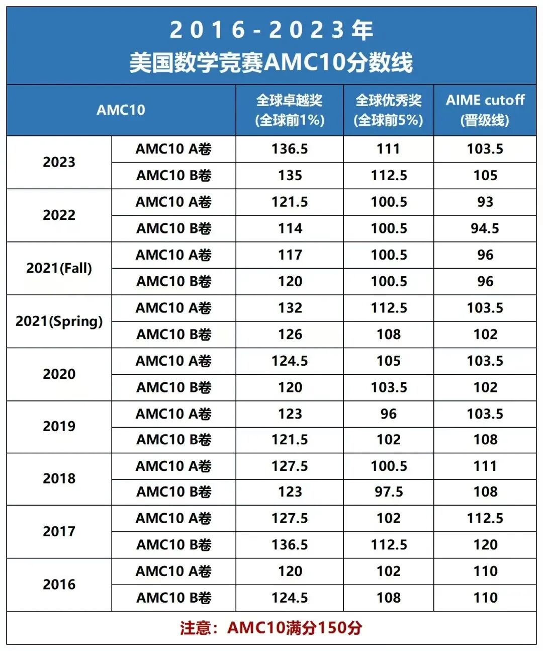 从 AMC10 历年分数线(含 A/B 卷)来看: