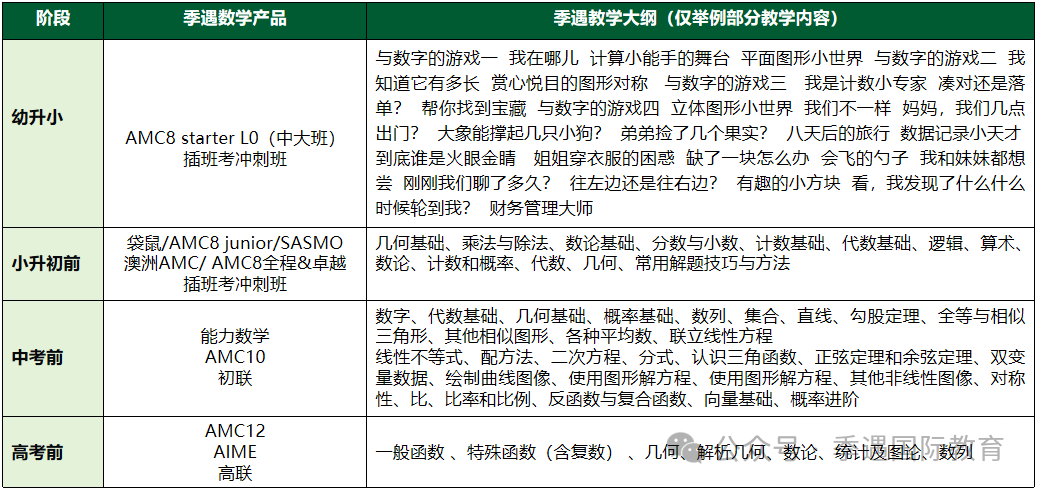 季遇教育数学产品从K班的兴趣启蒙到12年级的名校冲刺,每个阶段都有不同的重点和目标。