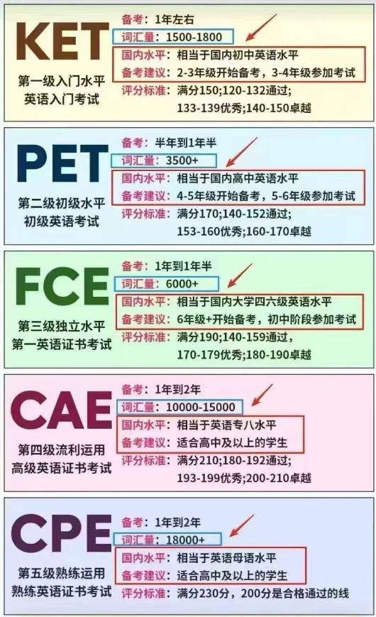 比如,在北京,剑桥五级英语考试(KET、PET、FCE等)已经成为许多家庭的热门选择,尤其是那些注重英语教育和小升初择校的家庭。通常,大家认为如果孩子通过PET,就基本搞定中考英语了;通过FCE,高考英语也不在话下。换句话说,只要小学阶段通过了这些考试,整个中学阶段的英语学习似乎就不用愁了。