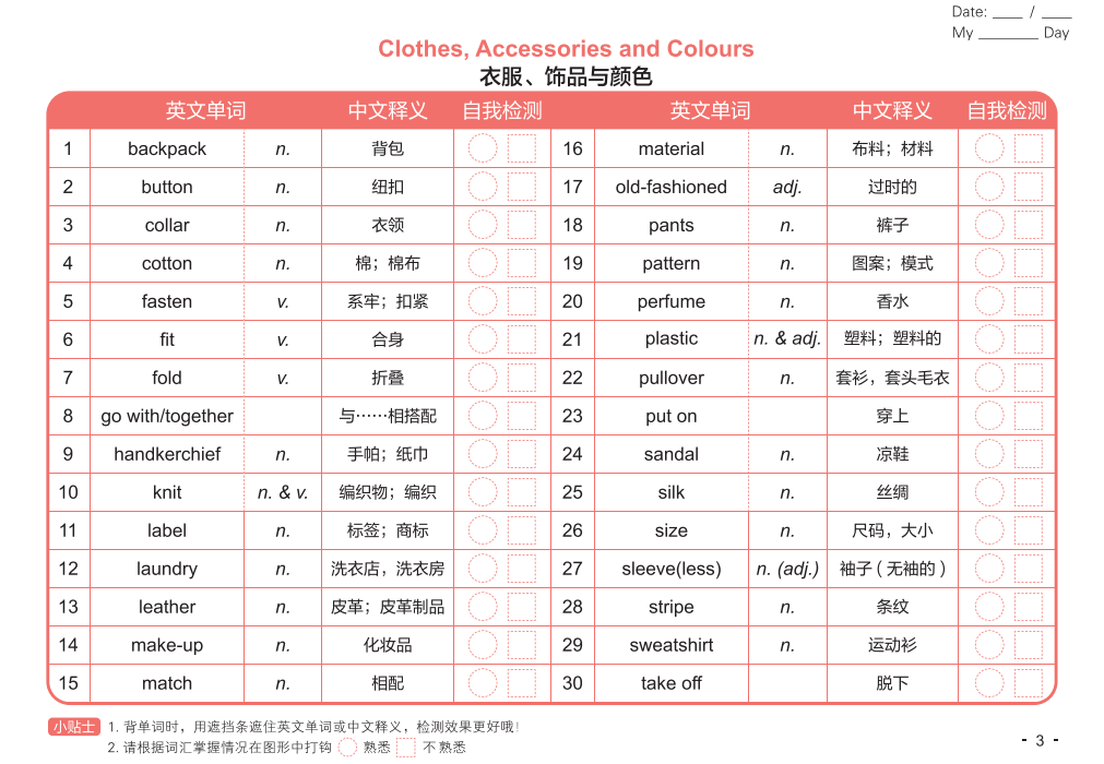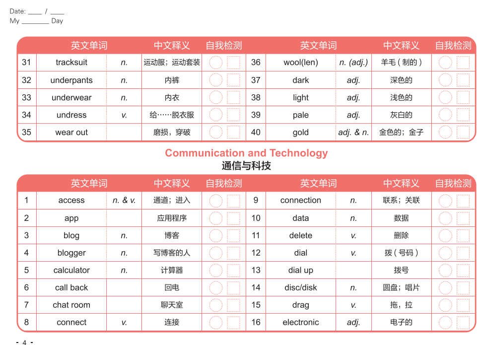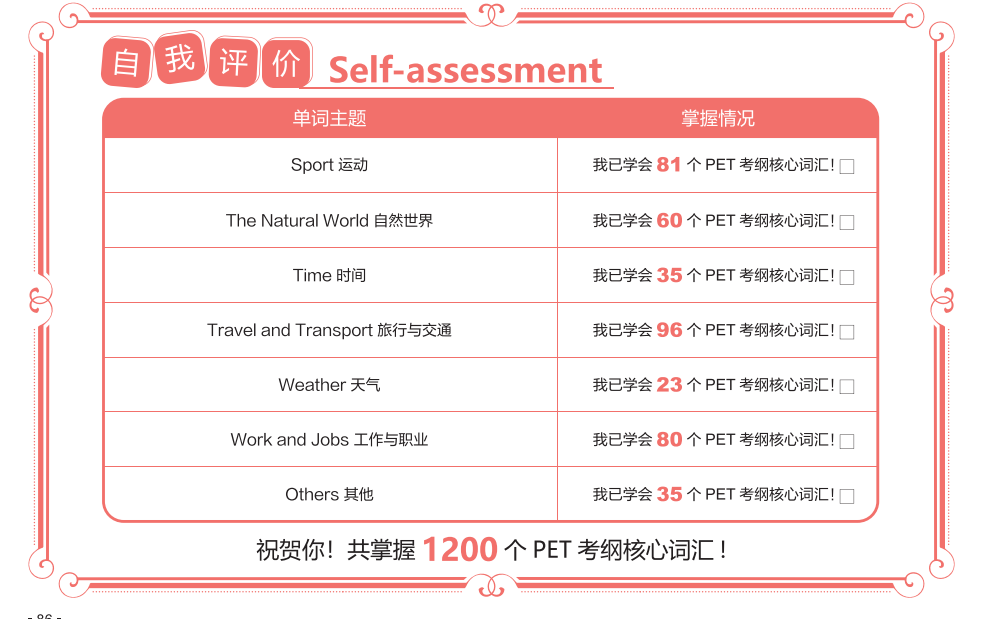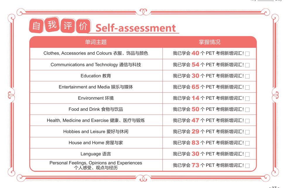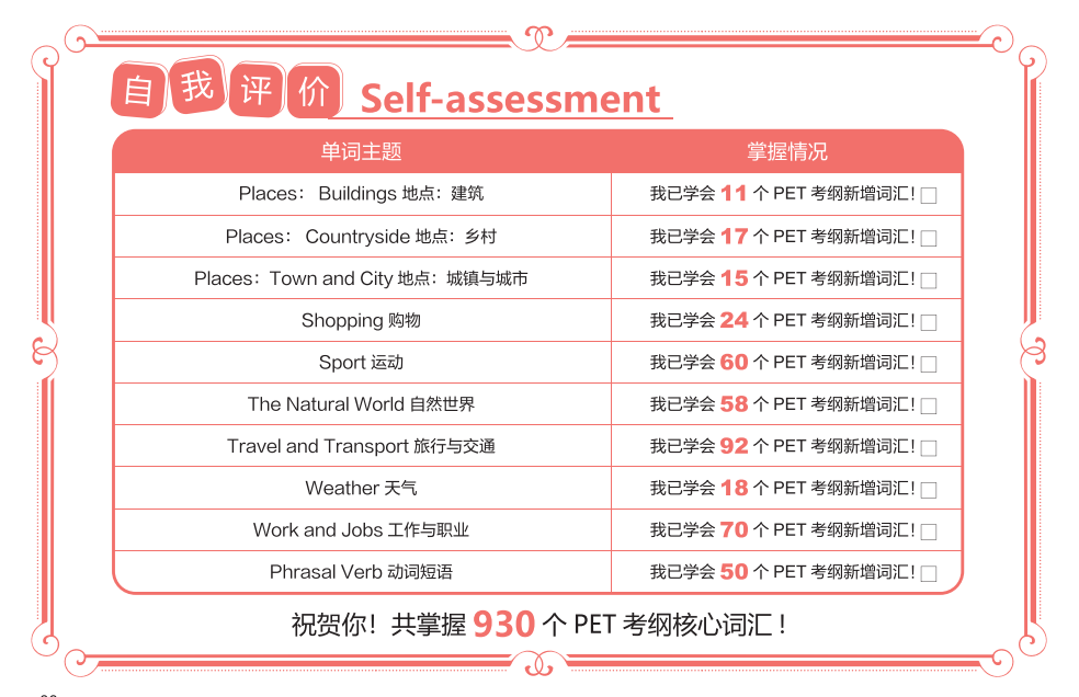 PET词汇自检表,包含词汇自检,词汇巩固,词汇练习+参考答案!资料共107页30天搞定PET词汇,背的同时搭配自测表,查缺补漏记的更牢固哦~资料领取咨询:jiyujiaoyu081PET词汇自检部分【自检表】 这个自检表可以打印出来,贴在孩子的学习桌上,每天对照着检查单词掌握情况,超级方便! 【情景练习】 每个单词都配有生动的句子,让孩子在语境中学习,不仅记得牢,还能学会地道的表达! 【事半功倍】 有计划有方法的记忆,比死记硬背效率高多了,孩子学习起来也更轻松,家长也省心! 【使用方法】 1. 打印自检表,每天对照检查。 2. 用情景句子练习,加深记忆。 3. 定期复习,巩固记忆。 PET词汇巩固部分PET词汇练习部分附参考答案季遇PET培训课程季遇教育细化小学阶段英语学习的时间线,找到了英文的科学辅导方式,针对不同阶段目标同学开设课程。1、KET/PET课程适合学生:G1-G2,词汇量500以内学习目标:衔接小托福,或近期有KET/PET考试计划把国际原版think教材融入教学中,同时加入ket和pet考试训练课。让学生提高听说读写综合能力,同时,有备考标化考试的能力。2、小托福课程→季遇小托福课程基础段适合学生:G3-G4学习目标:小托福目标分700分+→季遇小托福课程强化-冲刺班适合学生:G4-G6学习目标:小托福目标分780+、850+小托福 PET KET 英语启蒙